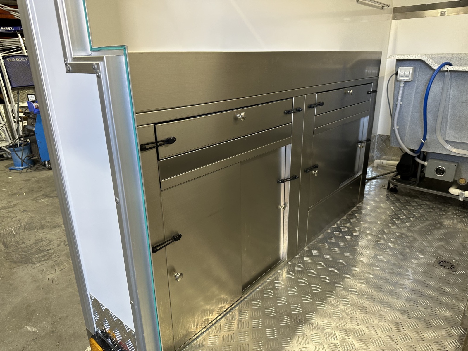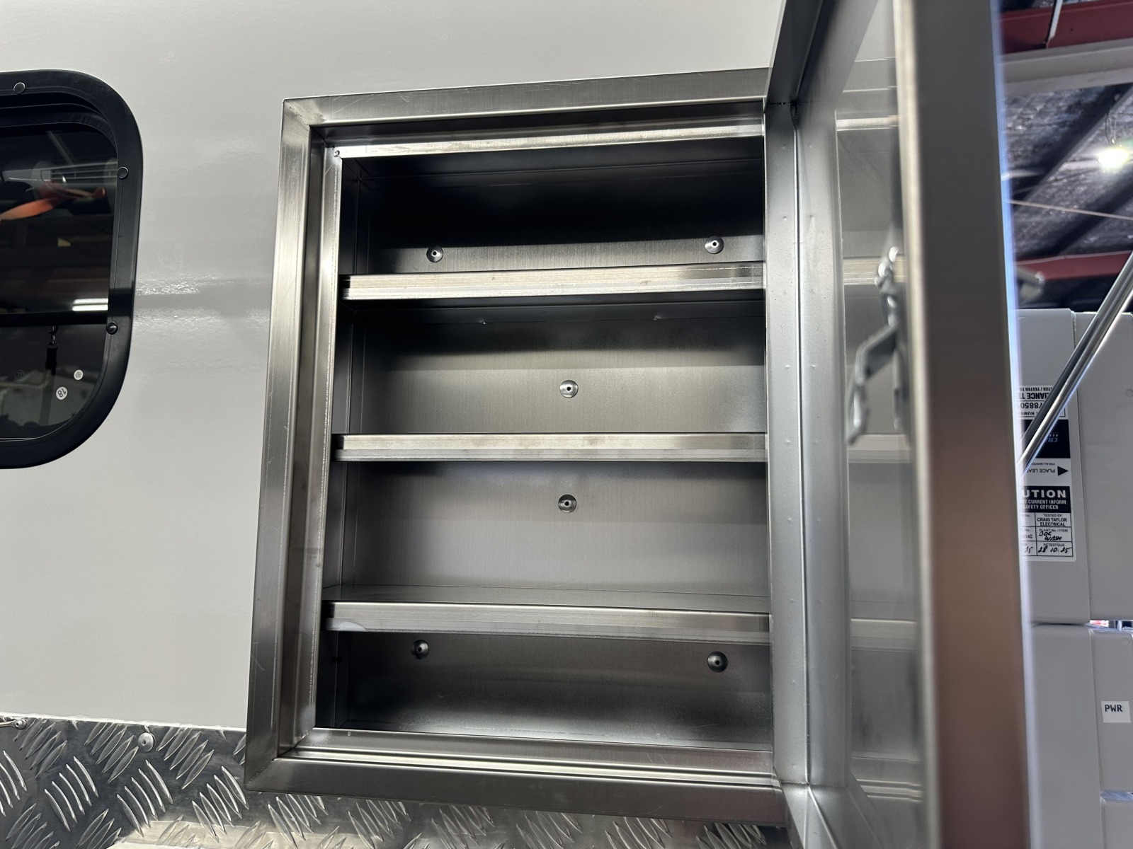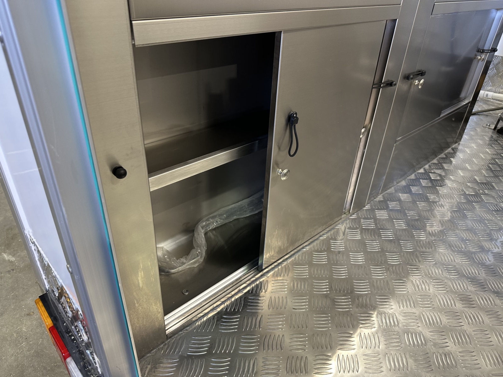 Fully enclosed stainless steel cabinet with two shelves– this means you can store items easily while driving without having to worry about them falling out